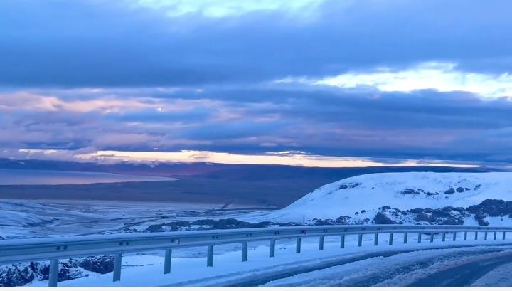 网友发布的视频显示,前往纳木措的公路上有不少雪,汽车行驶速度较慢,公路两侧的山坡上已盖了厚厚一层积雪。镜头拉远,每座山都变成了“雪山”,和天空的云朵相接,十分美丽。