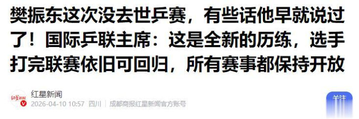 红星新闻——樊振东这次没去世乒赛,有些话他早就说过了!国际乒联主席:这是全新的历练,选手打完联赛依旧可回归,所有赛事都保持开放